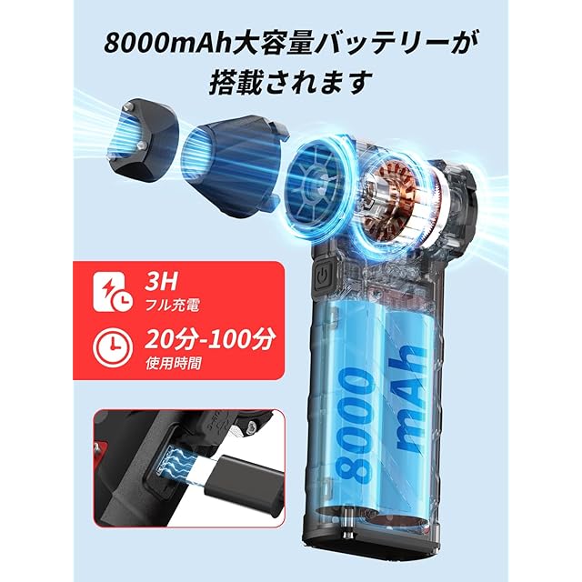 【TYPE-C充電式&大容量バッテリー】TYPE-C充電式で便利になります。8000mAh大容量バッテリーが搭載されて、約3Hでフル充電できです。最大風速で20分間使用可能です。電源ボタンの下に残量表示のインジケーターライトがあり、バッテリー切れることがすぐに見つけます。