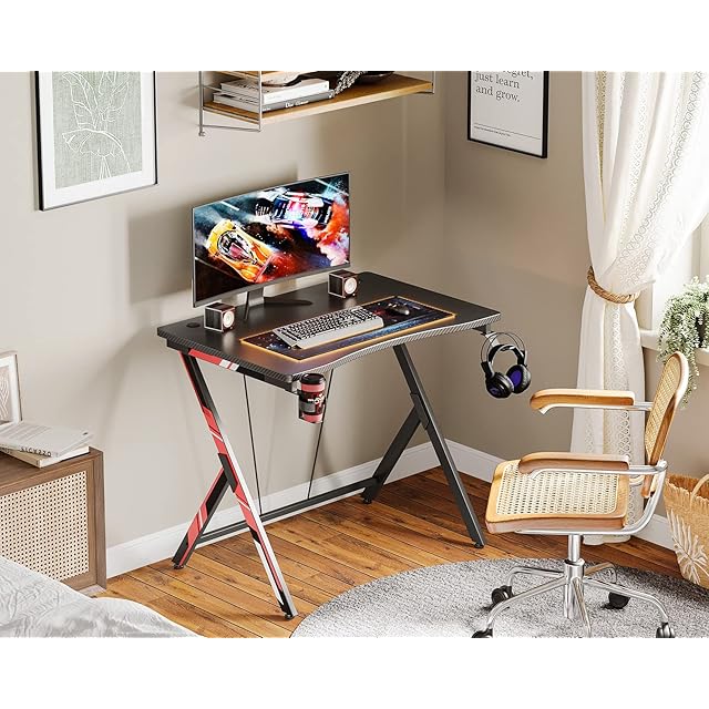KKL ゲーミングデスク 幅80cm*奥行55cm*高さ75cm パソコンデスク ス字脚 デスク ゲーミングテーブル PCデスク 炭素繊維天板 カップホルダーとヘッドフォンフック付き ゲームデスク ブラック