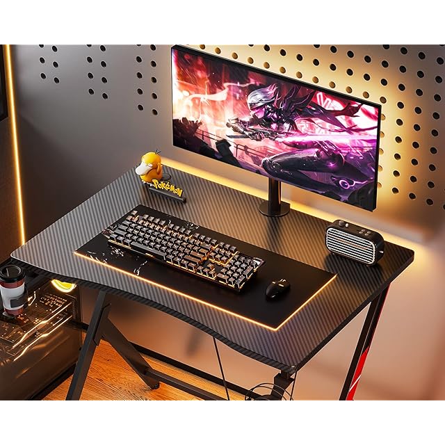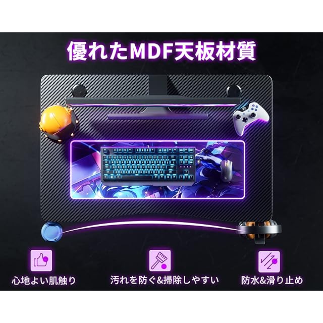 【滑り止めの炭素繊維天板】ゲーミングテーブルは厚さ15mmの板材が採用し、加え特殊な炭素繊維テクスチャ表面、耐水·耐熱·耐食·耐磨耗、触り心地がよい。黒と反射繊維のストライプはクールだけてなく、滑り止め性能で偶発的な接触や損傷を防ぐことができます。質感のある表面は未来感と実用性を兼ね備えて、快適で滑らかな感触はゲームの楽しみを満喫させます。