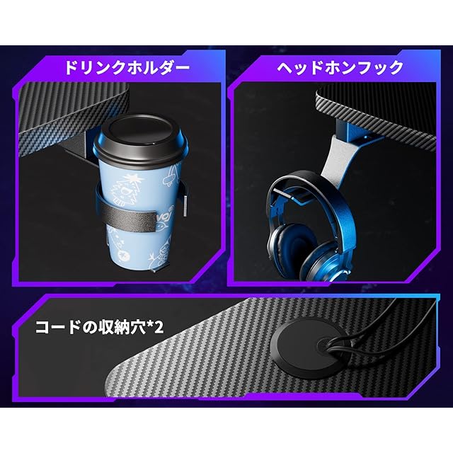 【充実なサポート機能】こちらのゲームデスクはゲーミングに特化した機能が満載。ヘッドホンホルダー、ドリンクホルダーがあり、ゲームと作業スペースがアップ、もっと楽に楽しめます。ワイヤー収納穴が2個付きで、デスクは壁に付く可能で、作業スペースはきれいになります。