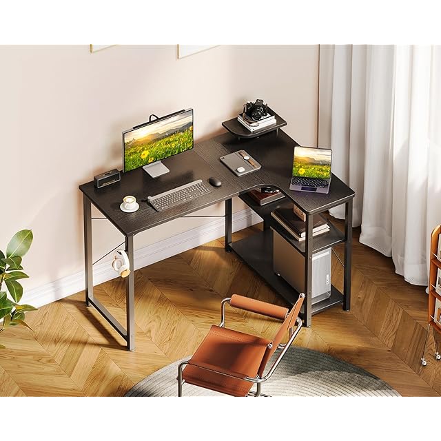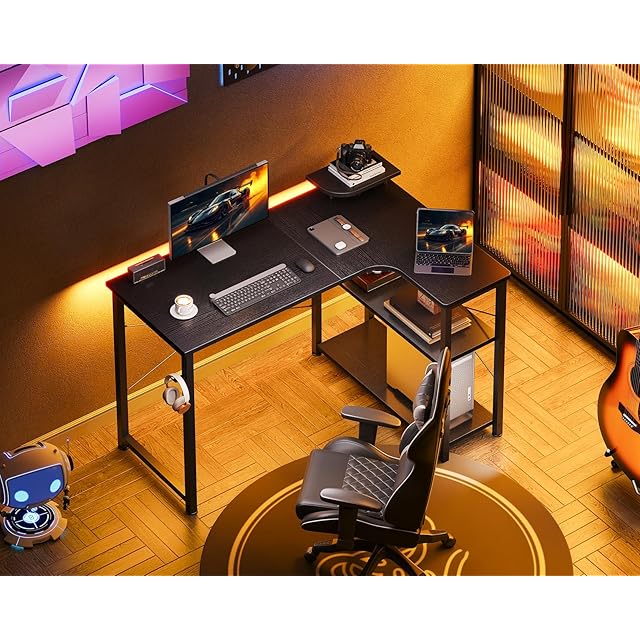 【ラック付きl字デスク】デスクの足元には一体型のラックが備え、本や書類などを使いたい時にサッと取り出せます。たっぷりの収納でデスク周りをスッキリ快適に!また、L字型のデザインで部屋のコーナーを最大限に活用でき、ご家庭でもオフィスでも、日常の操作に十分なスペースを確保できます。