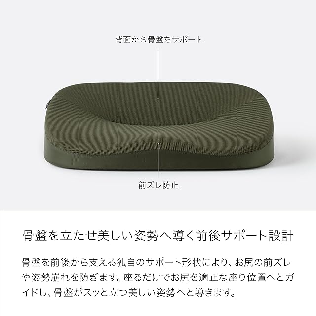 ④骨盤を立たせ美しい姿勢へ導く前後サポート設計 骨盤を前後から支える独自のサポート形状により、お尻の前ズレや姿勢崩れを防ぎます。座るだけでお尻を適正な座り位置へとガイドし、骨盤がスッと立つ美しい姿勢へと導きます。