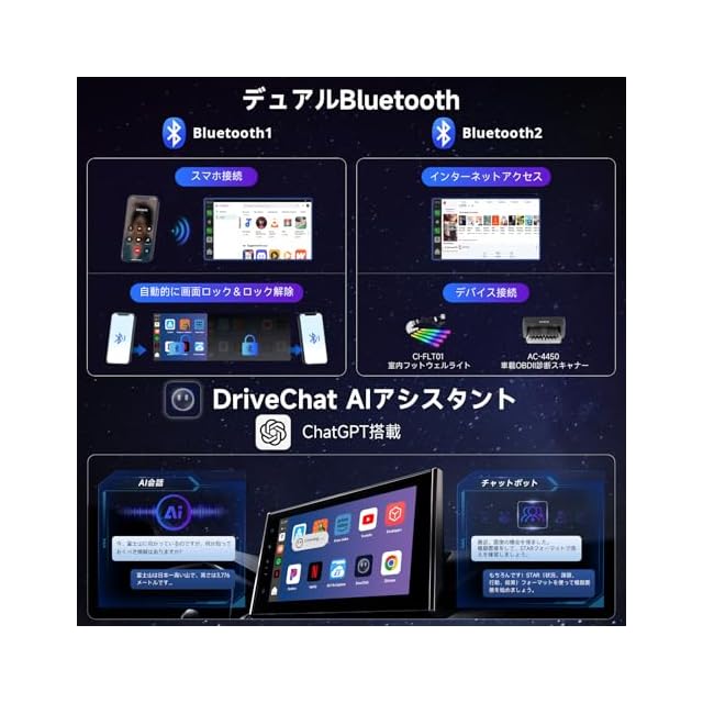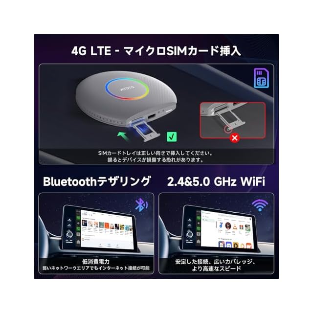 Wi-Fi接続に関する注意事項:ワイヤレスCarPlayまたはワイヤレスAndroid Autoを使用する際には、内蔵の4G LTEを通じてインターネットに接続してください。代替手段としてBluetooth 2も利用可能です。ワイヤレスCarPlayやワイヤレスAndroid Auto使用中は、Wi-Fi接続はサポートされていません。