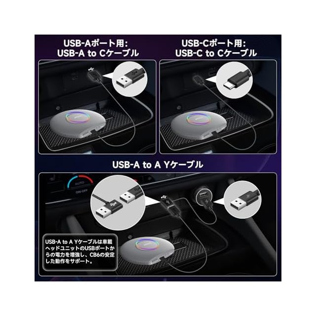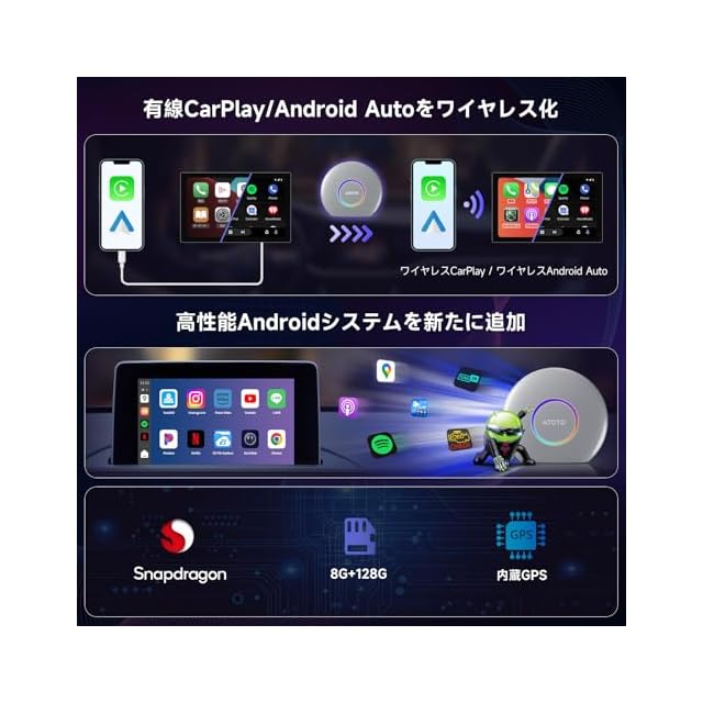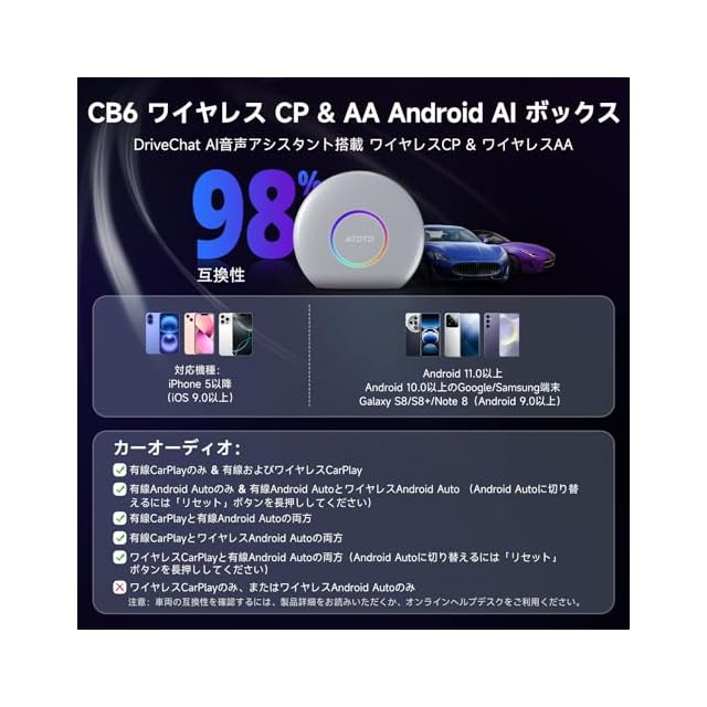 ワイヤレス接続へのアップグレード:CB6 Androidボックスを使用して、車の有線CarPlayやAndroid Autoをワイヤレスに変換できます。元々どちらか一方のみをサポートしているステレオでもシームレスな体験を提供