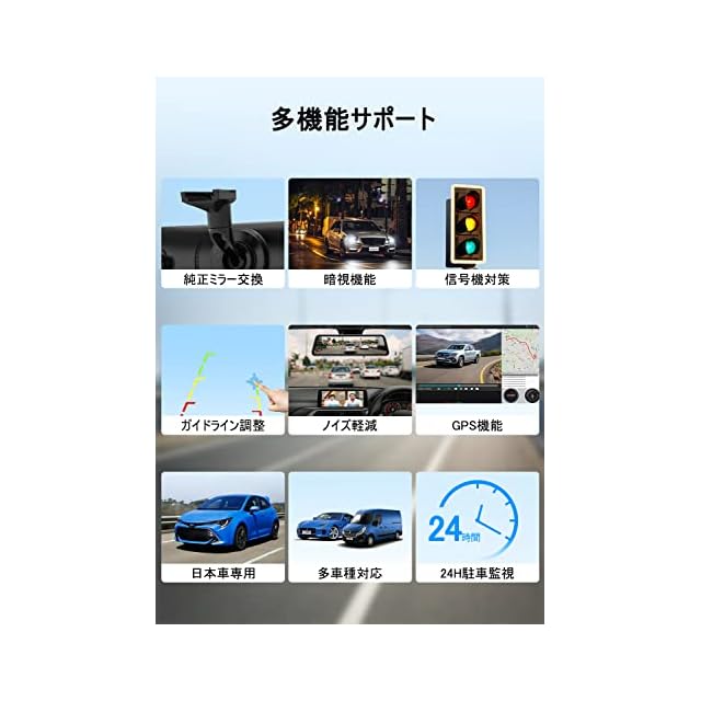 【色んな車種に取り付け可能】◆色んなメーカや車がありますが、4種類のブラケットが付属しているので、ほとんどの車種のメーカーの車に適応することができます。適用のステーがない場合、付属のブラケットでフロントガラスに貼り付けてドラレコを取り付けできます。もし、取り付けできるのか、ブラケットに合うか不安な場合は弊社に直接にメールで問い合わせすることができるので、取り付け可能か心配な方は確認しても良いです。◆リアカメラ用ブラケットを三つ付属されており、更にIP68防水で、車内車外(日本製の軽自動車を含み)に取付できます。◆ リアカメラには駐車支援機能付きで、ギアをバックに入れた際は自動でガイドラインが表示されます。ガイドラインの長さや角度は自由に調節可能で、様々なサイズの車に対応しています。バックモニターを搭載していない車の場合、かなり便利に使える機能です。
