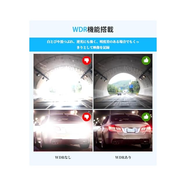 【肉眼で見た時に近い鮮明な画像】明るい画像と暗い画像のいいとこ取りをして、肉眼で見た時に近い鮮明な画像に仕上げる技術を「WDR(ハイダイナミックレンジ)」と言います。白とびや黒つぶれ、 逆光にも強いので、トンネルでの明暗もしっかり補正し、キレイな映像を記録します。フロントカメラには強度の高いWDR補正が掛かっており、トンネル出口付近での白飛びに滅法強いのが特徴です。夜間のヘッドライトが反射したナンバーの認識能力も強WDRの恩恵で非常に高くなっています。