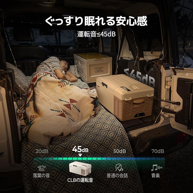 【家庭用&車載用の2WAY対応】AC/DC電源に対応したポータブル冷蔵庫で、室内でも車内でも幅広く活用可能。DC電源(12V/24V)に対応しており、軽自動車、普通車、大型トラックなどさまざまな車両で使用できます。また、車載用として使用しない時は、AC電源(100V-240V)を利用して室内用の小型冷蔵庫としても便利に活用できます。アウトドアから日常生活まで、多様なシーンに適用します。また、45dBの静音設計なので、寝室や車中泊時にも睡眠を妨げることはありません。