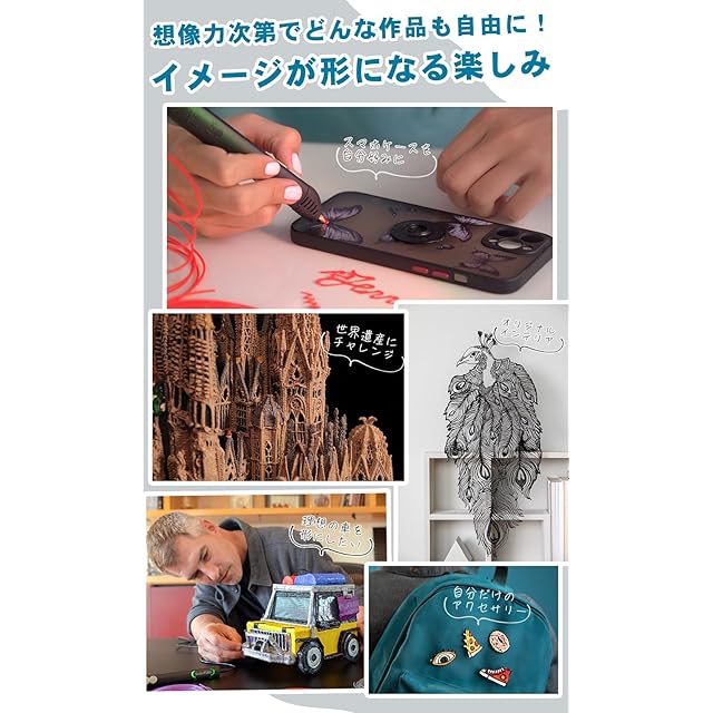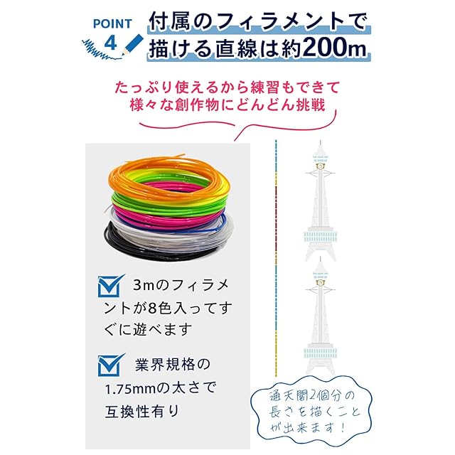✅【パッケージ内容】1:本体(ペン) 2:8カラーのPLAフィラメント(1カラー:約3m、細さ:1.75mm)※カラーは写真と異なる場合があります 3:電源アダプター 4:ツール 5:日本語説明書をダウンロードできるQRコード 6:ガイドブック(日本語版) ※商品の仕様は通知なしで、変更や改善されることがあります。(変更や改善によって写真のものと異なる仕様の場合があります)