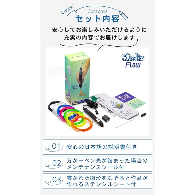 3Doodler FLOW 3Dペンになります。 ✅【ご購入前に必ずご確認下さい】 先端が非常に熱くなりますので使用中に先端を触らないでください。特にお子様がご使用する際は十分に気を付けて下さい。 ✅【パッケージ内容】1:本体(ペン) 2:8カラーのPLAフィラメント(1カラー/約3m、細さ/1.75mm)※カラーは写真と異なる場合があります 3:電源アダプター 4:ツール 5:日本語説明書をダウンロードできるQRコード 6:ガイドブック(日本語版) ※商品の仕様は通知なしで、変更や改善されることがあります。(変更や改善によって写真のものと異なる仕様の場合があります)