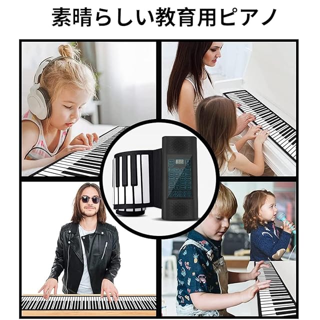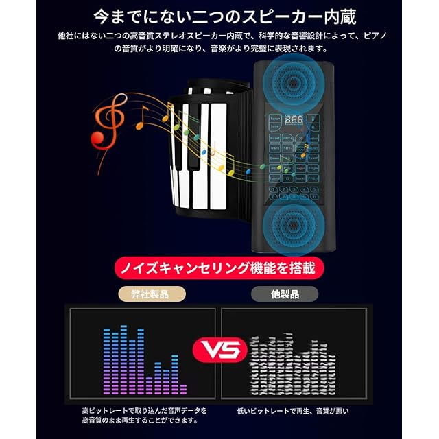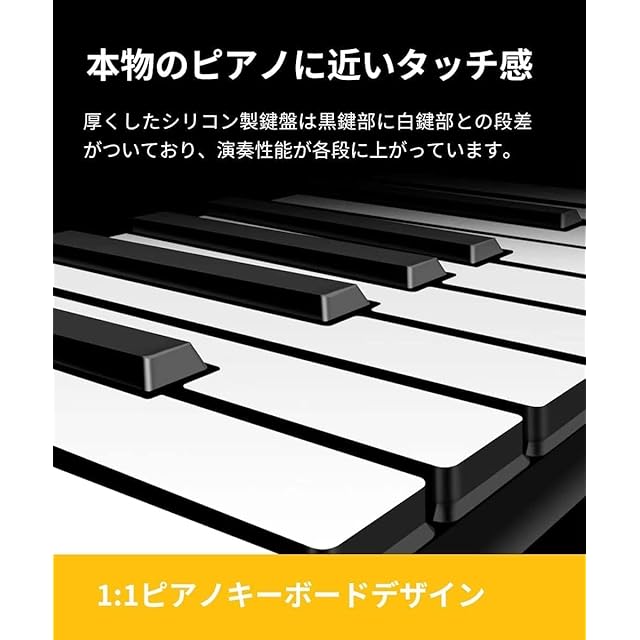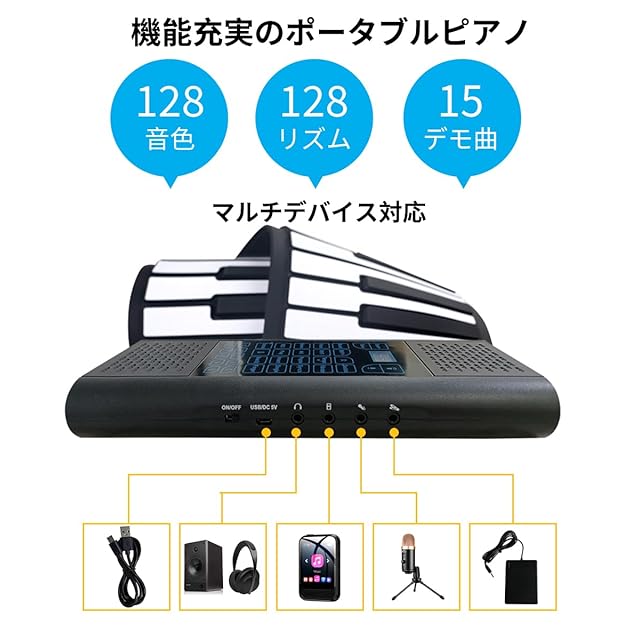 商品名:ロールピアノ 88鍵盤 電子ピアノ 2つのスピーカー内蔵 音符シール付き 128種類音色 128種類リズム 15デモ曲 USB充電式 midiキーボード 楽器 おもちゃ 子供 初心者 練習用 誕生日 プレゼント ギフト 日本語説明書付き
