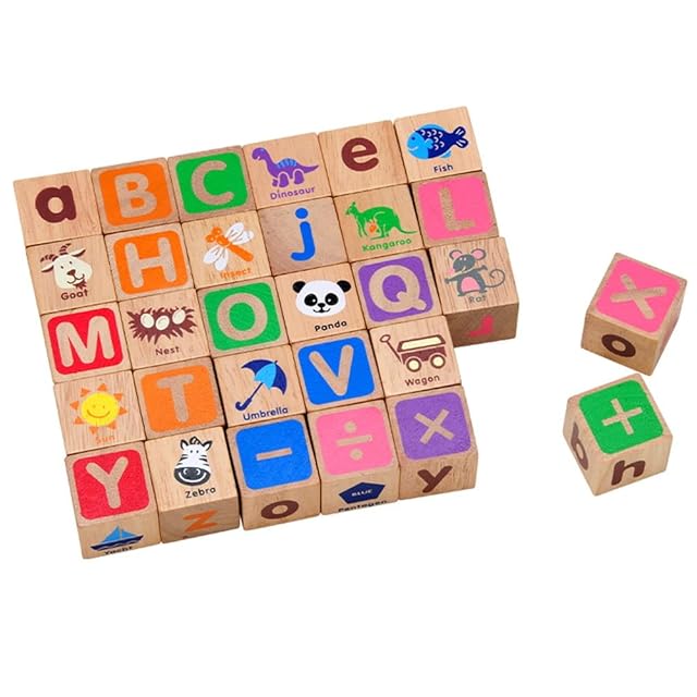 【イラストが可愛い30ピース】30ピースのブロックそれぞれにアルファベット(大文字、小文字)」、「数字」、「記号」やアルファベットの文字に対応するイラストをプリント!楽しく遊べる積み木セットです。