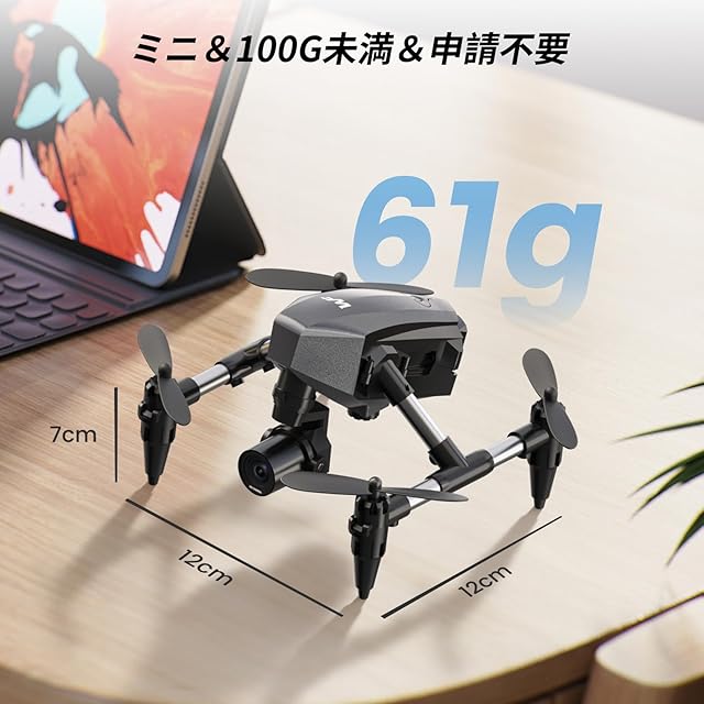 【100g未満&申請不要】重量はわずか61gで、100g未満ですので、機体の登録は必要ありません。製品が届いたら、すぐに遊ぶことができ、非常に便利です。子供へのプレゼントとして最適です。また、コンパクトなサイズであり、室内での飛行練習にも適しています。