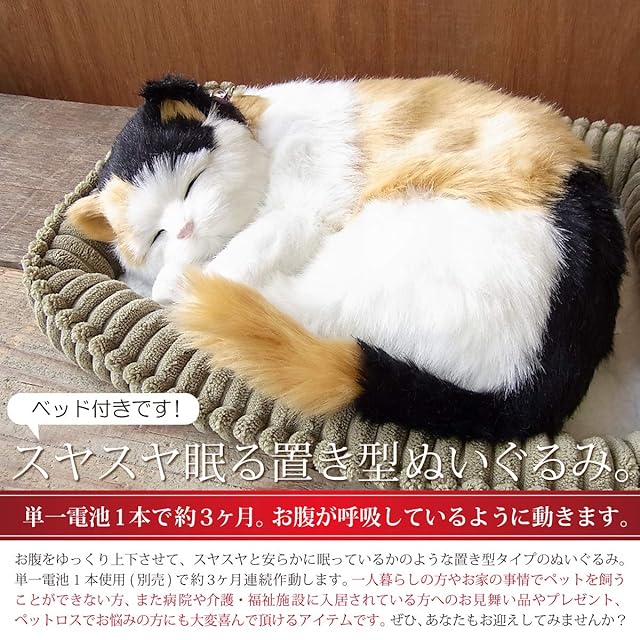 本物そっくりに眠るぬいぐるみシリーズです。<br> 単一電池1つでおよそ3ヶ月間、お腹が呼吸をしているように動きます。<br> リアルな寝姿に「えっ本物?!」と思ってしまうほどの可愛さです。<br> お子様やご高齢者、一人暮らしの方やマンション等のペット不可の方へおすすめです。<br> <br> 【ご注意】<br> ・内容品に電池は付属しておりません。お手数ですが別途ご用意ください。<br> ・本体にはスイッチはございません。電池を入れた段階から動き出します。<br> ・こちらは観賞用に近いぬいぐるみ(置物)となります。撫でたり触ったりは問題ございませが、遊んだり抱っこしたり、一緒に寝れるようなタイプではございませんのでご注意ください。<br> <br> 【】に関して<br> ご購入から6ヶ月間、動作不具合等がございました場合、交換修理対応を致しております。<br> レビュー欄からの問い合わせは、ご対応が出来かねますので、購入履歴からご連絡をお願い致します。<br> モーターやギアの可動によりジー、グーといった音がしますが、これは正常な状態となります。<br> そのほか不具合かと思われる事象が発生した場合は、ご連絡ご相談ください。<br>