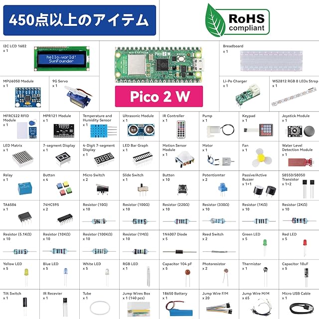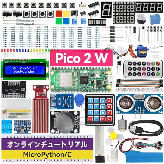 商品名:SunFounder Raspberry Pi Pico 2 W 究極スターターキット、110以上のビデオ講座とオンラインチュートリアル付き、96プロジェクト(内16はIoTプロジェクト)、MicroPython、C++対応(Arduino IDE互換)、オンラインチュートリアル(日本語)