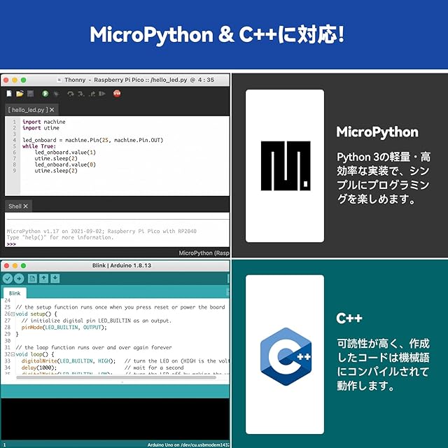 2つのプログラミング言語に対応:MicroPythonとC/C++の2つのプログラミング言語をサポートしており、多様なプログラミング学習体験を提供します
