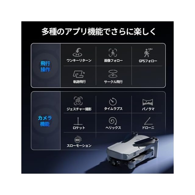 【APPで多機能体験】専用アプリでタイムラプス、パノラマ、ロケット、ヘリックス、ドローニ、スローモーションなどの撮影機能が体験するだけでなく、自動帰還、自動追尾、軌跡飛行などの飛行機能も実現できます。コストパフォーマンスの高いGPSドローンです。
