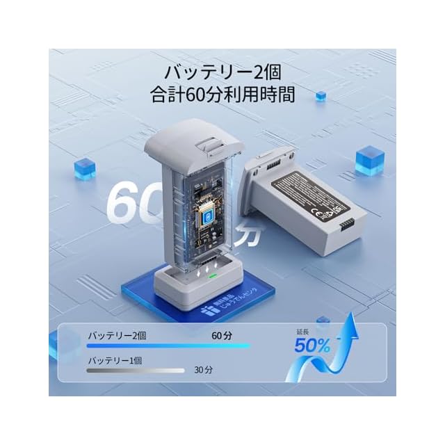 【60分利用時間】バッテリーが2個付き、満充電すると、1個の利用時間が30分、2個で合計60分まで飛行できます。十分にドローンの操作を楽しめます。