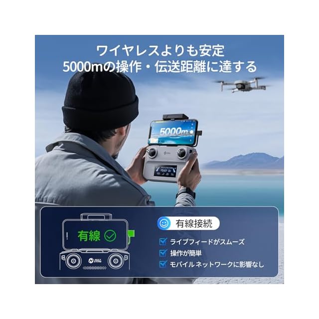 【5KM操作・伝送距離】有線接続を採用し、障害や干渉がない場合には約5000メートルの操作および転送距離を実現します。無線接続よりも安定しており、画面がより滑らかです。また、モバイルネットワークへの干渉もなく、操作がより便利です。