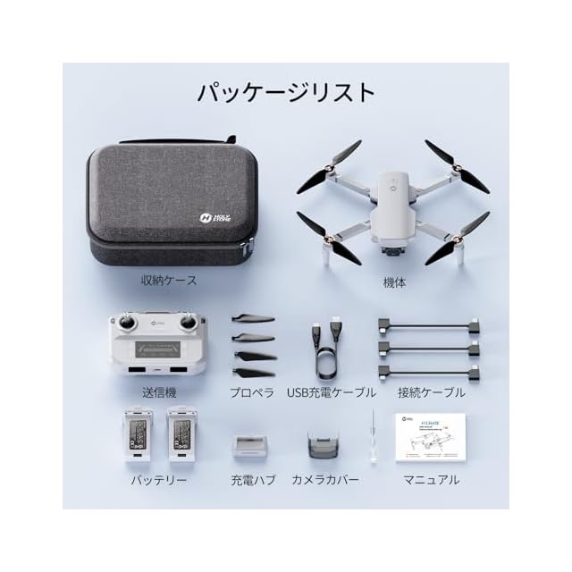 【パッケージ内容】機体*1、送信機*1、収納ケース*1、バッテリー*2、充電ハブ*1、プロペラ*4、充電ケーブル*1、接続ケーブル*3、カメラカバー*1、日本語マニュアル*1