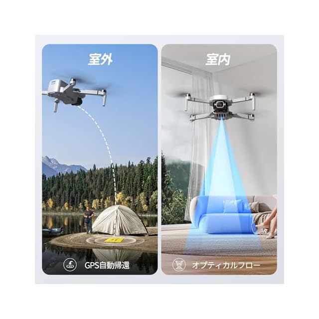 【GPS・オプティカルフロー搭載】GPS測位システムで、飛行中ドローンの位置が精確にロックできます。GPSモードで自動帰還機能に移行したら、ドローンが記録された場所に戻れます。ドローン紛失を心配する必要がありません。また、オプティカルフローポジショニングを加えて、室内でも安定に操縦できます。