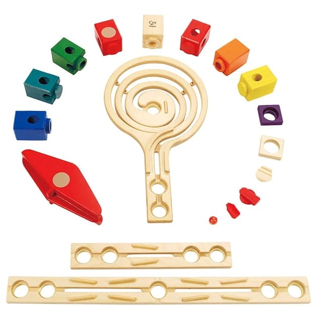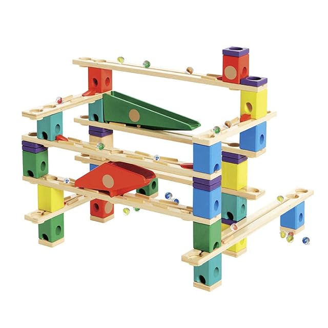 【セット内容】ブロック(8種類)24個、スパイラルレール3本、直線レール(長)3本、直線レール(短)4本、シーソーパーツ1個、補足パーツ(5種類)48個、ビー玉(袋入り)50個