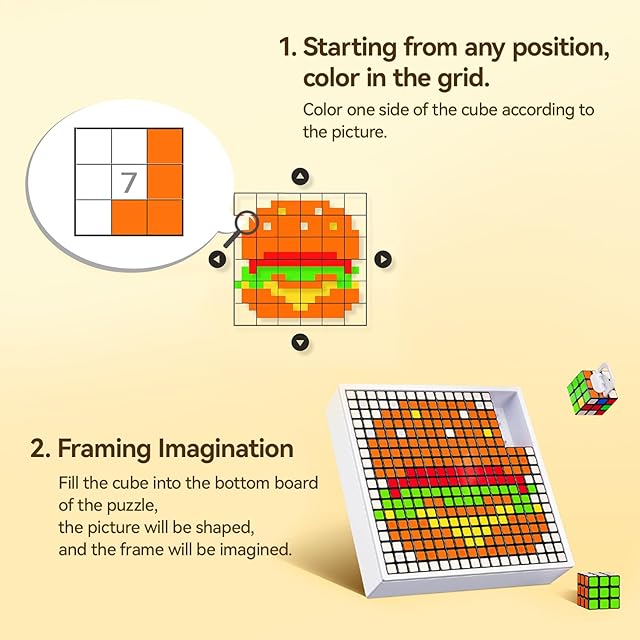 クリエイティブパズル:自分でパターンを選んだり作ったりして、写真の位置に合わせてルービックキューブを色付けします。パズルを解くことで子供や大人の創造力、空間感覚、記憶力を向上させます。ルービックキューブを吊り穴とテーブルトップスタンド付きの正方形ボードに入れてパズルを完成させます。