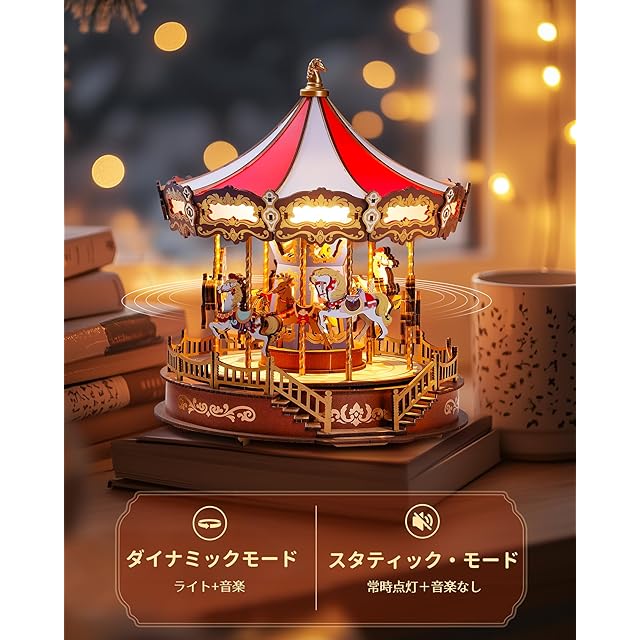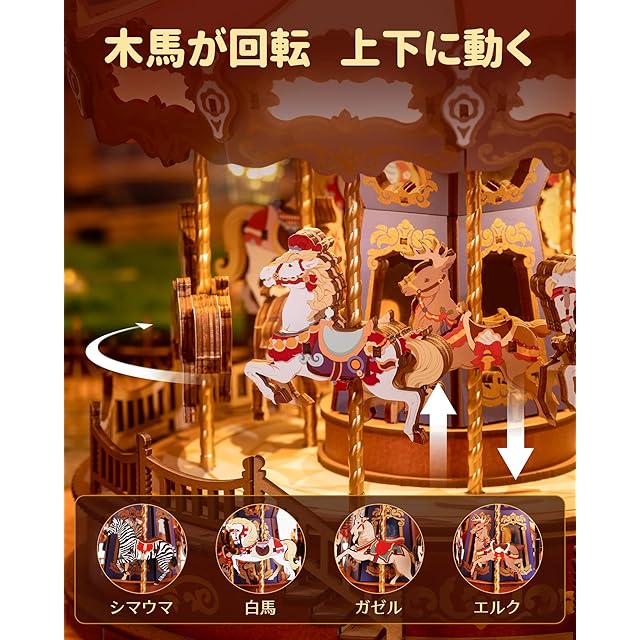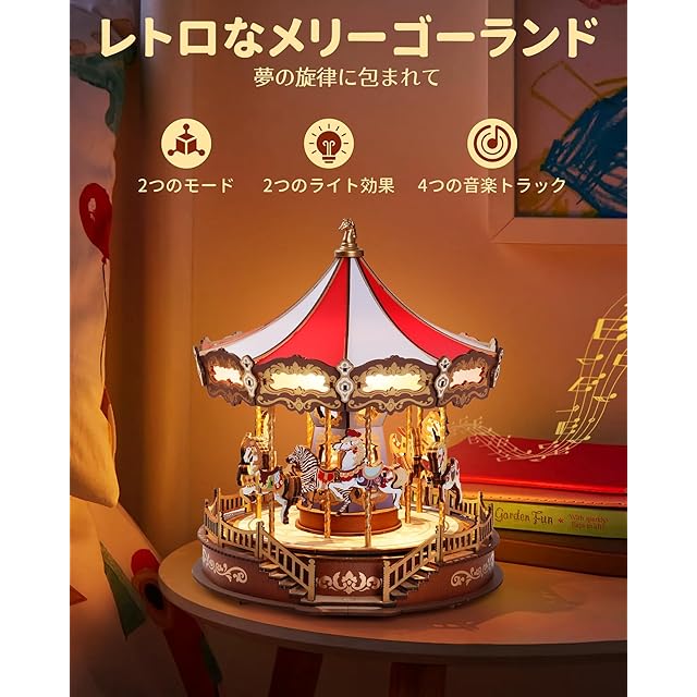 商品名:ROBOTIME 立体パズル 3d ウッドパズル 木製 パズル LEDライト付き 組み立て オルゴール クラシックメリーゴーランド 工作キット DIY クラフト インテリア 暇つぶし 知育玩具 子供 大人向けの木製モデル 誕生日 クリスマスプレゼント