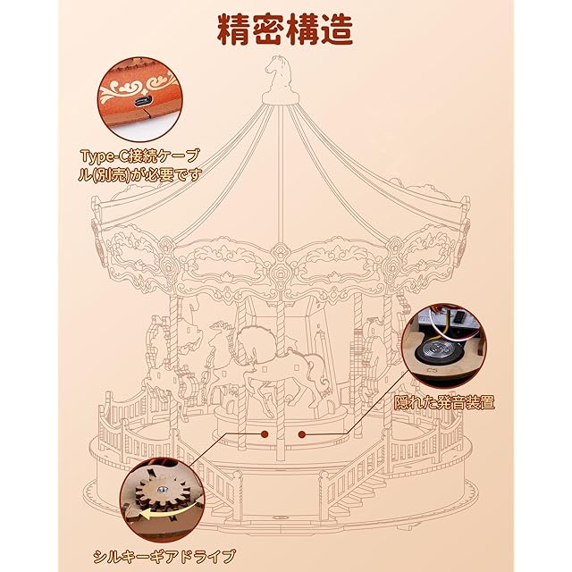 こちらの3D木製パズルで、クラシックなメリーゴーラウンドの魅力をお家にお届けしませんか? 回転するトップと、音楽が流れると命を吹き込まれるように動き出す馬たちが、まるでおとぎ話のような世界を作り出します。大人向けのコレクターズアイテムとして、組み立ての楽しさも満喫できる逸品です!