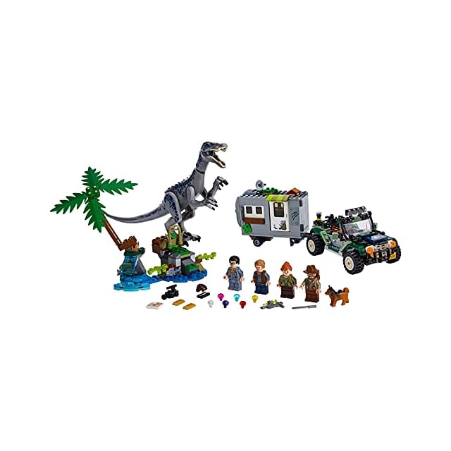 このレゴ ジュラシック・ワールド恐竜のおもちゃは4つのミニフィギュア:オーウェン・グレイディ、クレア・ディアリング、ダニー・ネーデルマイヤー、シンジン・プレスコット、と 犬のレッドフィギュア、巨大な恐竜のバリオニクスフィギュア が付いています。