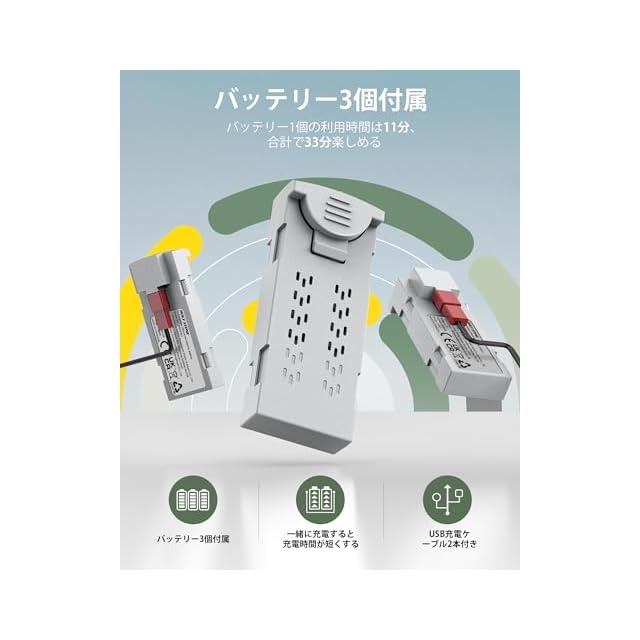 ✈【バッテリー3個】3つのバッテリーが付属しており、1つのバッテリーの使用時間は11分です。3つのバッテリーを合計すると、33分間の飛行が可能です。予備のバッテリーを持って遊ぶことで、バッテリー切れの際に交換することが便利です。さらに、2本の充電ケーブルも付属しており、同時に充電することで充電時間を節約できます。
