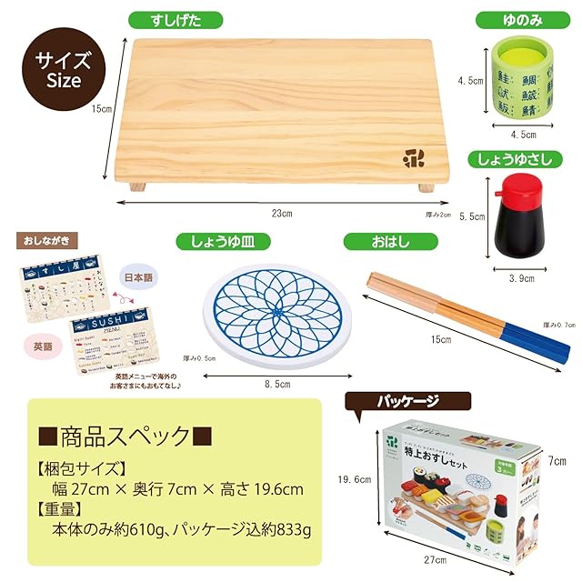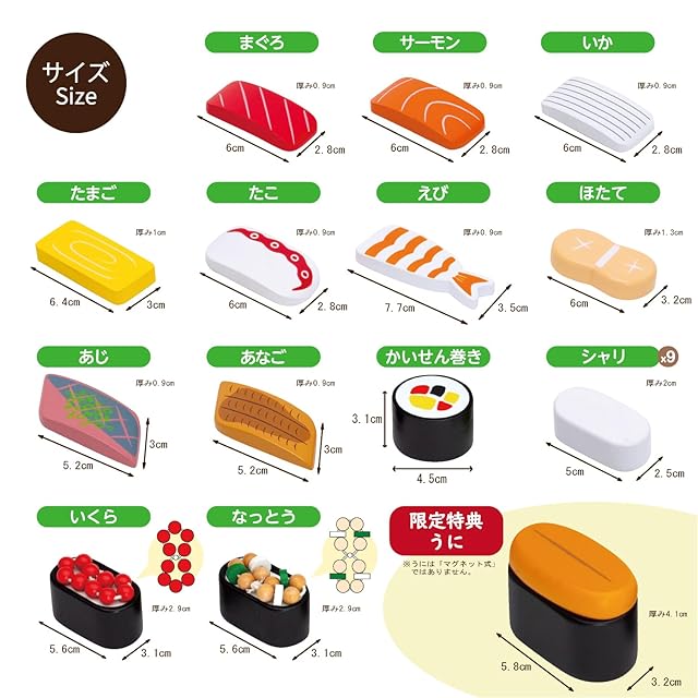 【内容物】シャリ×9、たまご×1、いか×1、あなご×1、まぐろ×1、えび×1、たこ×1、あじ×1、サーモン×1、ほたて×1、いくら×1、なっとう×1、かいせん巻き×1、ぐんかん巻き×2、ゆのみ×1、おはし×1、すしげた×1、しょうゆ×1、しょうゆ皿×1、おしながき×1、クッションシール×4、うに(限定特典)×1