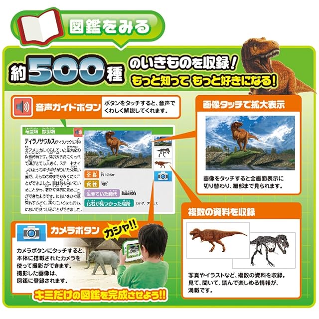 「図鑑NEO」の「動物」、「恐竜」、「魚」、「昆虫」の4冊から500種の生き物を収録
