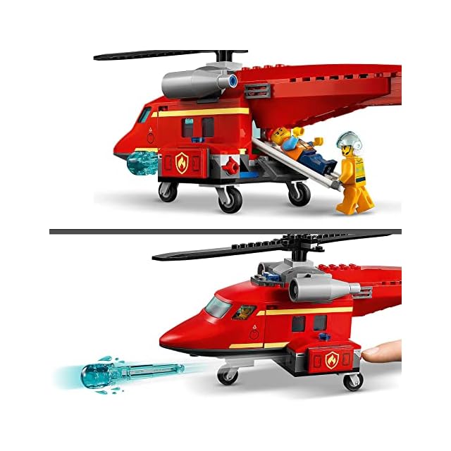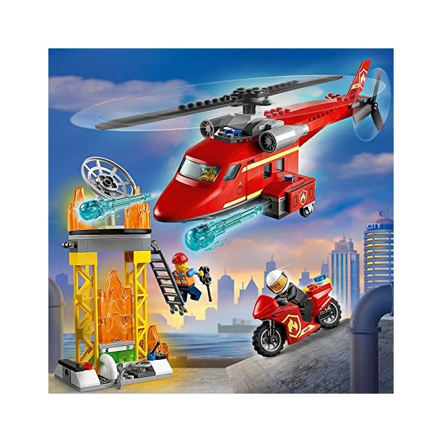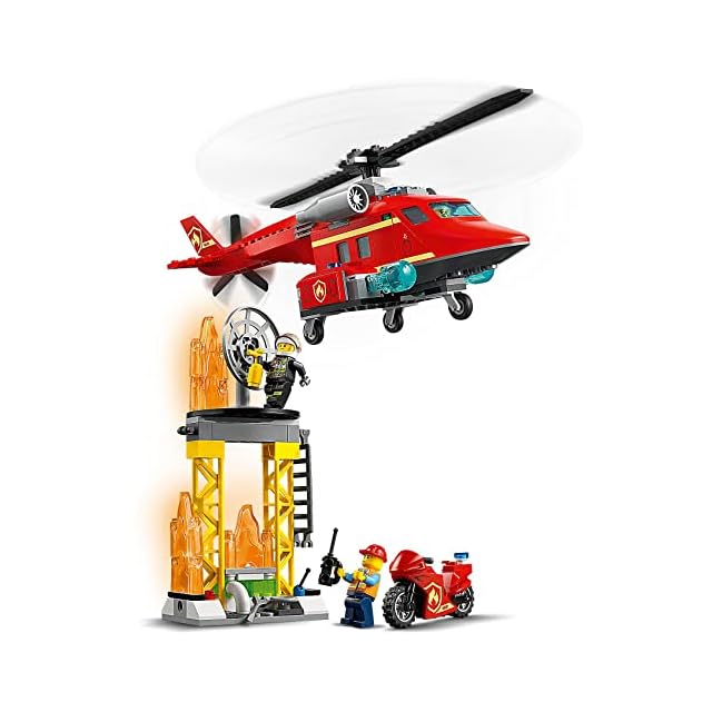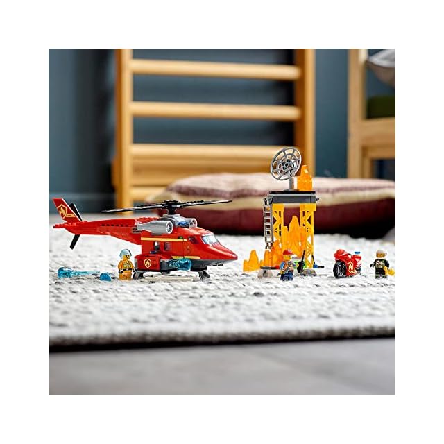 炎のパーツを重ねて作った大きな火事をめがけて、ヘリコプターの放水砲を発射!ミニフィグ3体付きで自分だけの物語をつくりましょう。