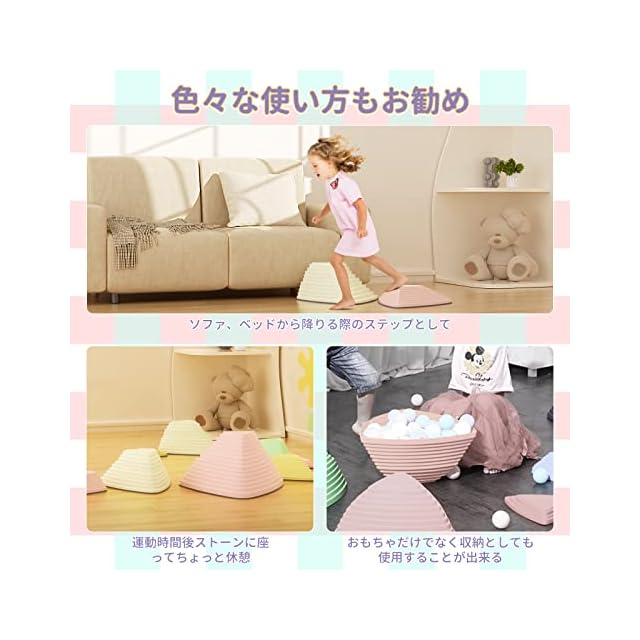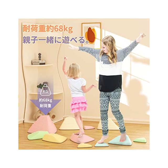 【親子で一緒に遊べます&様々な場合で大活躍】一番小さいなサイズでも約68kgの耐荷重があるため、親子で一緒に遊べます。お家で楽しく遊びながら、バランス感覚・柔軟性・体幹・距離感・筋力を身につけ、運動機能の基礎を構築できます。平らな床面の好きな位置するだけで簡単に遊び場が完成リビングで、子ども部屋で、保育園で、屋外で.....など様々な場所でお使いいただけます。
