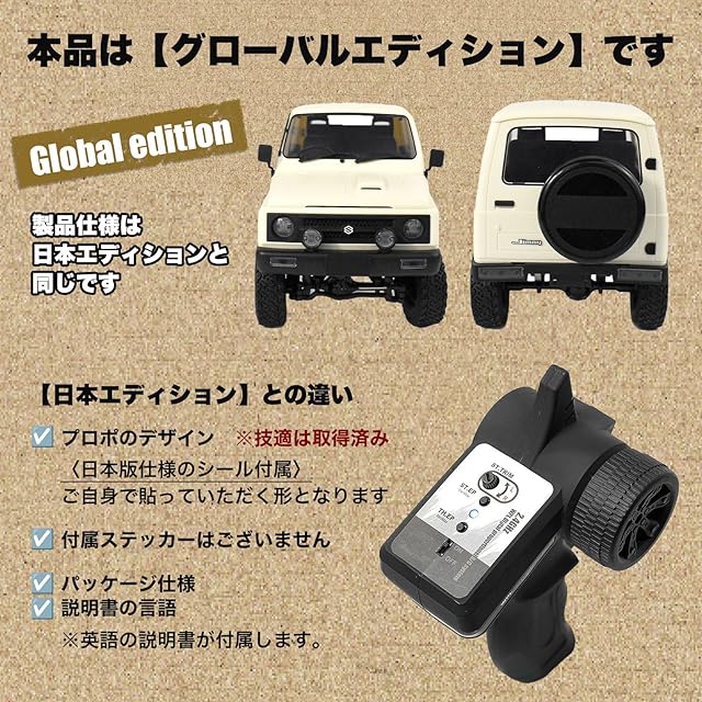 こちらはグローバルエディションです。【日本オリジナルステッカー】及び【ブランドロゴステッカー】は付属しておりません。 ■JA11 ジムニー(WPL JAPAN C-74)グローバルエディションと日本エディションの違い ・プロポのデザイン ※技適は取得しております。日本版仕様のシールが付属しますので、 ご自身に貼っていただきますようお願いいたします。 ・付属ステッカー ・パッケージ仕様 ・説明書の言語 ※英語の説明書が付属します。 ※製品仕様は日本エディションと同じです。