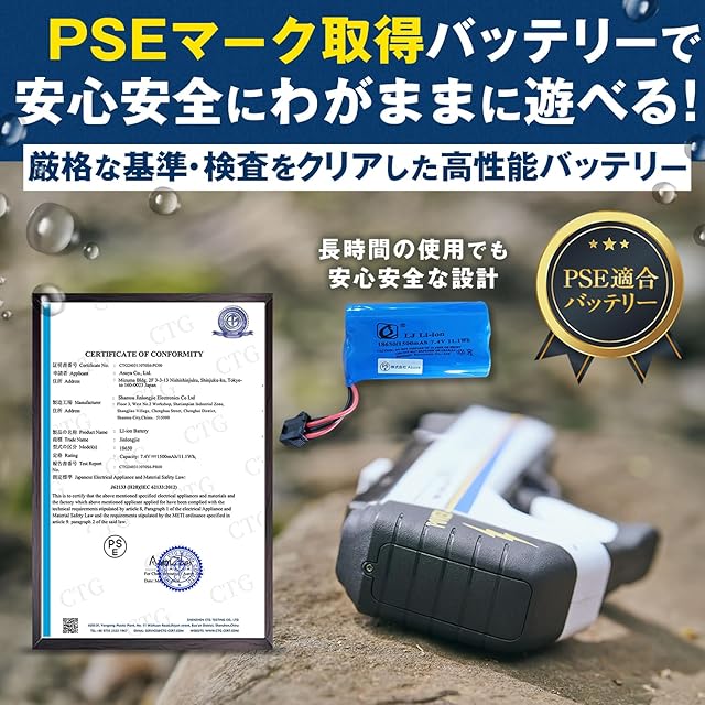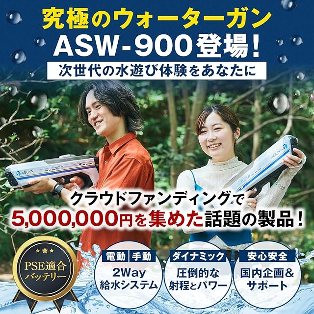 【家族みんなで安心!PSEマーク取得バッテリー搭載】水遊びに夢中になる時間を、心から安心して楽しんでほしいから。ASW-900の心臓部であるバッテリーは、厳しい安全基準をクリアしたPSEマーク付きの高品質なものを採用。小さなお子様から大人まで、誰もが安全に、そして思う存分、長時間のプレイに熱中できます。