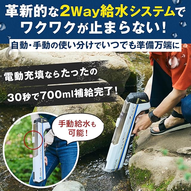 【遊びを止めない!画期的な「2Way給水システム」】「今、いいところなのに水切れ…」そんなガッカリを解消!わずか30秒で約700mlのタンクを満タンにする電動オートチャージ機能に加え、場所を選ばずサッと手動でも給水OK。白熱したバトル中でも、素早く給水してすぐに反撃開始!中断知らずのノンストップ水遊びで、最高の盛り上がりを逃しません。