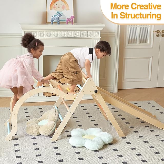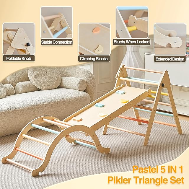 【パステル・ピクラー・トライアングルセット】この7-in-1パステル・ベビークライミングジムは、その多機能性に感動することでしょう。木製の三角形、リバーシブルなロッククライミングウォール(スライドとしても使用可能)、木製のクライミングアーチが含まれており、これらすべてが7-in-1です!クライミングアーチはひっくり返してバランスを鍛えるためのロッキングボートとしても使用でき、創造的な遊びができます。さらに、アーチの端についているフックデザインにより、プレイグラウンドの構築方法が増え、遊び方のバリエーションが広がります。