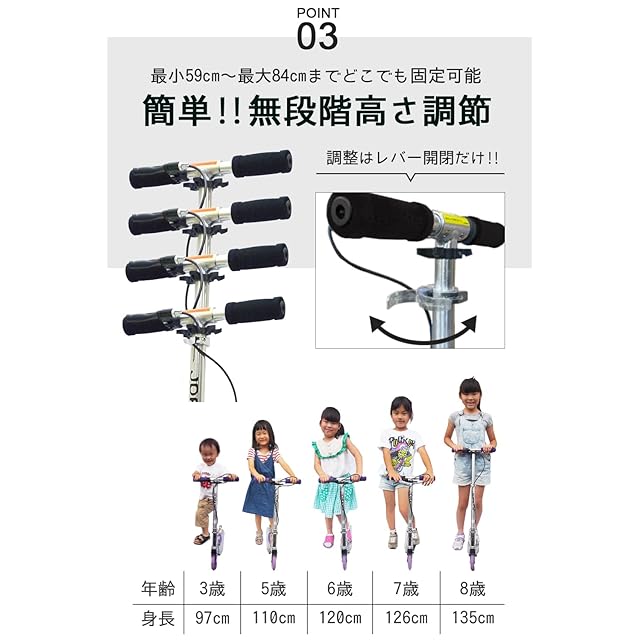 【高さはお好きな位置で固定可能】ハンドルの高さは段階的な調節ではなく、最小65cmから最大89cmまで子供の身長に合わせて自由な位置に簡単に固定できるので、一台あればみんなで遊べることができます。