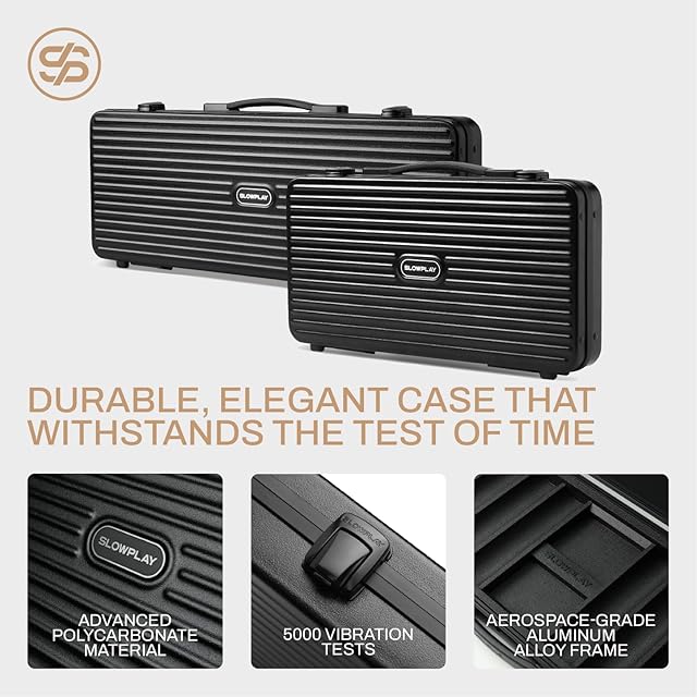 キャリーケース:SLOWPLAYが生み出した今までと全く異なるチップケース。外装にはシングル射出成形によって作り出されたポリカーボネート製のケース、アルミ合金製のフレーム、亜鉛製ロック、そして大きなハンドル。また内装は衝撃からチップ保護するためのPUレザーが施されています。これらの特徴はチップケースのデザイン製を高めるだけでなく、耐久性・ポータブル製をも大きく向上させています。