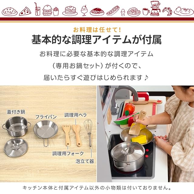 【商品詳細】 サイズ (約)幅70cm×奥行き30cm×高さ91.5cm/95cm/97cm 重量 (約)9.3kg セットアイテム 蓋付き鍋 / フライパン / 調理用フォーク / 調理用ヘラ / 泡立て器 各1個 材質 中密度繊維板、ステンレス 他 電源 単三乾電池2本 対象年齢 3歳以上 特記事項 こちらの商品はお客様組み立てとなります。 組み立てにはプラスドライバーが別途必要です。 本商品には電池は付属しておりません。
