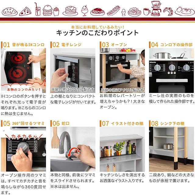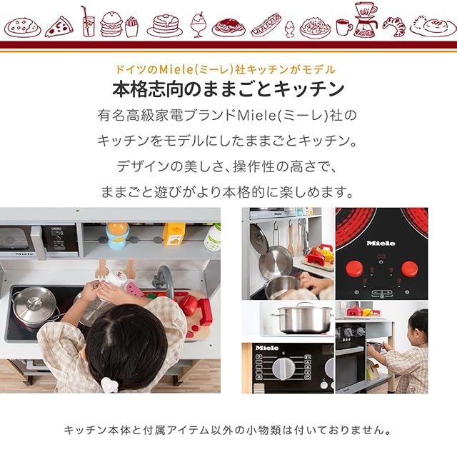 【本格志向のままごとキッチン】 高級家電ブランドとして知られる、Miele(ミーレ)社のキッチンをモデルにしたままごとキッチン。デザインの美しさ、操作性の高さで、ままごと遊びがより本格的に楽しめます。