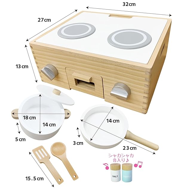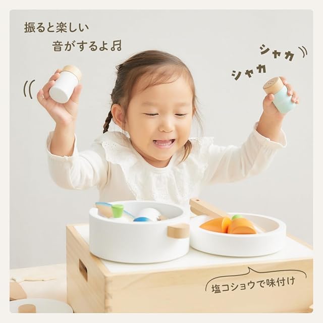 【対象年齢】3歳以上 【セット内容】木箱、食材7種、まな板、包丁、鍋(ふた付き)、フライパン、塩、コショウ、お玉、フライ返し 【素材】天然木、MDF 、磁石 【木箱サイズ】幅21.5×奥行15×高さ8cm