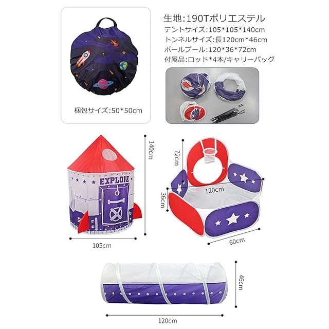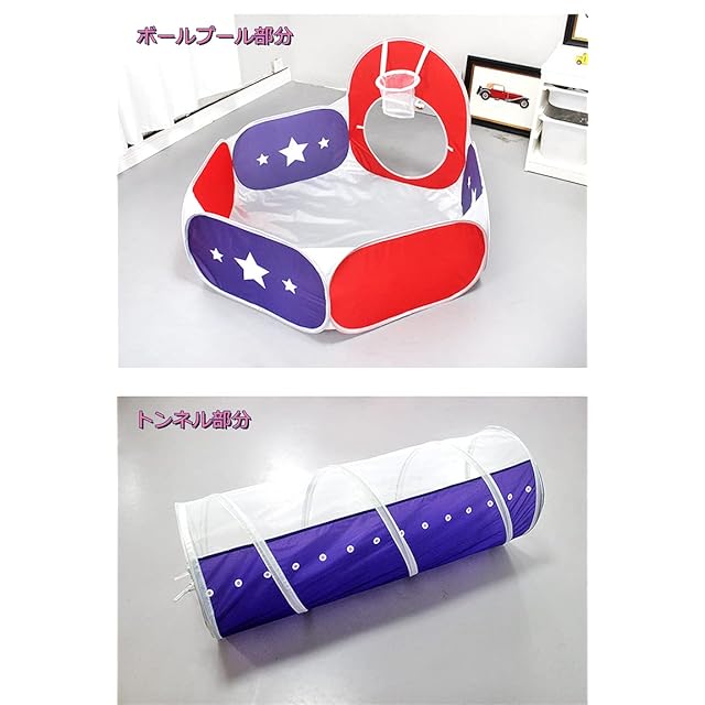 ✦【セット内容】製品はテントハウス、トンネル、ボールプールが3点で構成されています。状況に応じて、自由に組み合わせて使うことができます。子供に楽しい遊び場をつくりあげます。組立寸法:テントハウス/幅105cm*高135cm、トンネル/幅46cm*長120cm、ボールプール/長120cm*36cm*72cm
