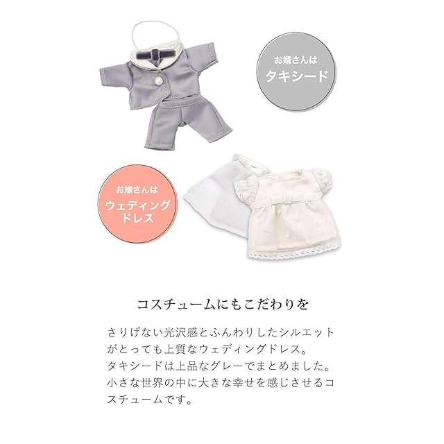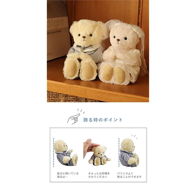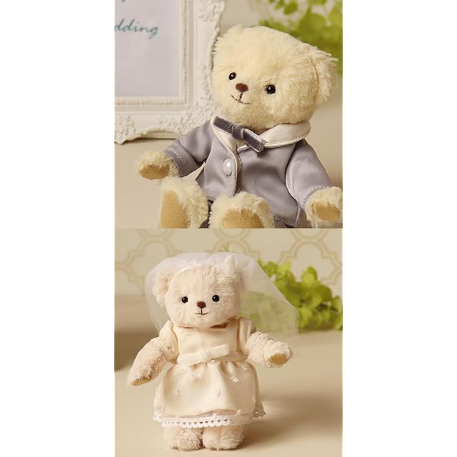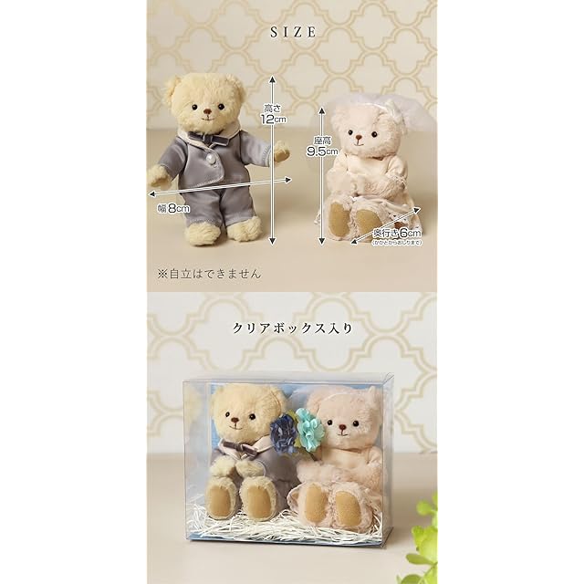 こだわりが詰まった12cmテディベア 結婚式のウェルカムスペースに飾ることができます。また手のひらにマグネット入りで、手を合わせたりポーズが変わるのも楽しい! ウェディングドレスとタキシードは細部までこだわった本格コスチュームとなっております。そのまま飾れるクリアボックス入り。