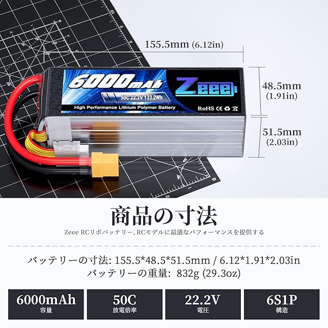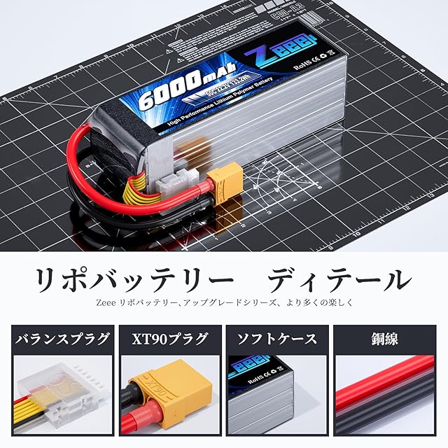 【高性能】ゼエエ(Zeee)22.2V 50C 6000mAh リポバッテリーは日本と韓国からの優れたリチウムポリマー素材があります。そして、最大のエネルギー密度が235Wh / kgまで。リポバッテリーはメモリー効果がないので、昼休みや時間がある時に充電しても、いずれ問題がないです。