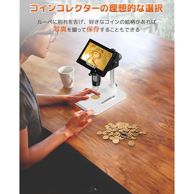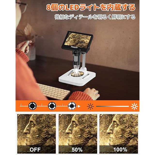 【4.3インチ液晶顕微鏡】コイン顕微鏡は720P高精細デジタルイメージング技術を採用し、LCD画面にリアルタイムで鮮明な画像と高品質なビデオを表示することができます。接眼レンズの顕微鏡に比べて、モニター付き電子顕微鏡は人間工学に適しており、目や首の疲れを大幅に低減しています。8つのLED補光ランプを搭載し、サンプルを観察する際に十分かつ適切な光源を提供られます。