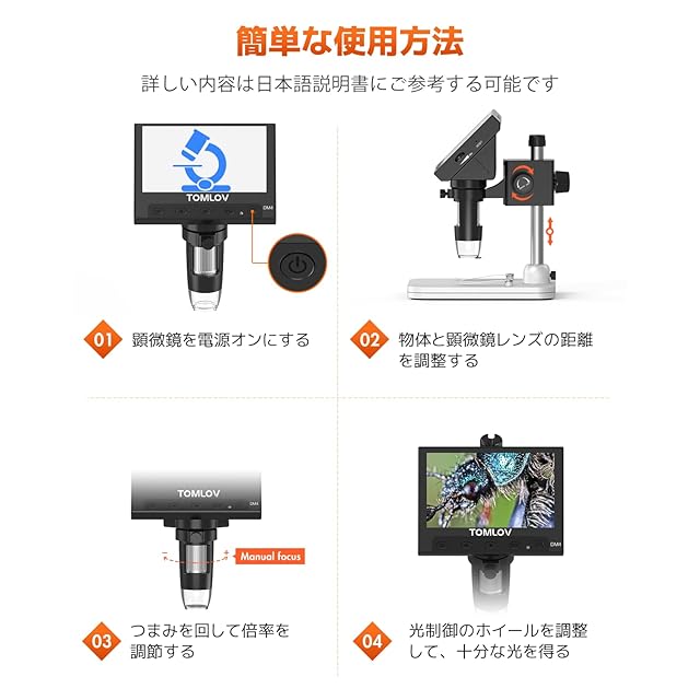 【日本語&安心対応】TOMLOV デジタル顕微鏡は安心のアフターサービスが付きます。万が一、運送途中での破損、本体に汚れなど初期不良の場合、交換&修理を承ります。ご使用中何か不明点がある場合、弊社にお気軽で連絡してください。平日では24時間以内、日本語対応しております。