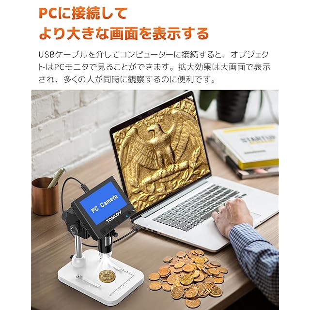 【高さ調整可能スタンド】TOMLOVコイン顕微鏡顕微鏡の物体距離が他の顕微鏡よりも長くなるように、レンズと物体との距離を調整することができます。距離が長くなるにつれて、拡大にする場合の調節時間が短くなります。