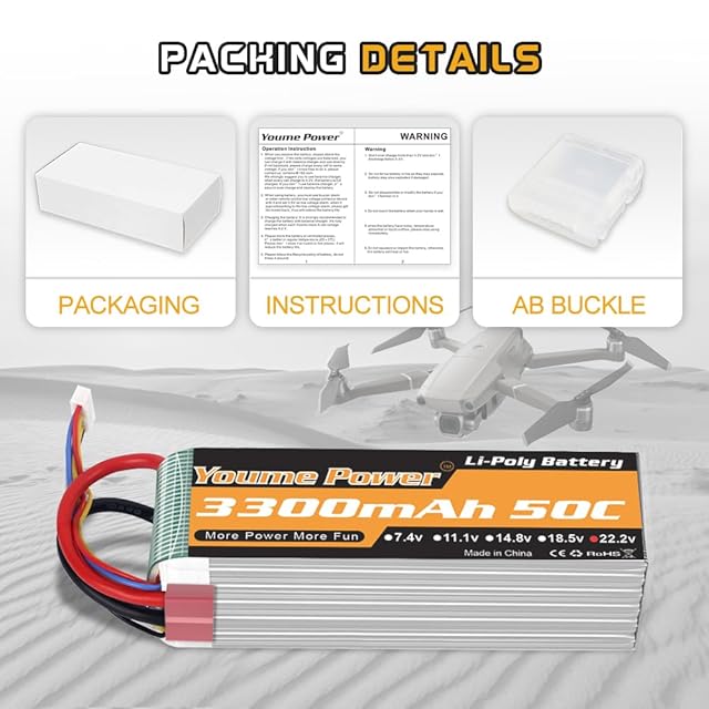 【仕様】素材:リチウムポリマー。バッテリー電圧:22.2V。セル:6S。セル電圧:3.2~4.2V。充電容量:3300mAh。放電:50C。放電プラグ:Deans T 型コネクタ。サイズ:136*45*46mm(±3mm) / 5.35*1.77*1.81inch。正味重量:490g±15g/1.08lb/17.28oz